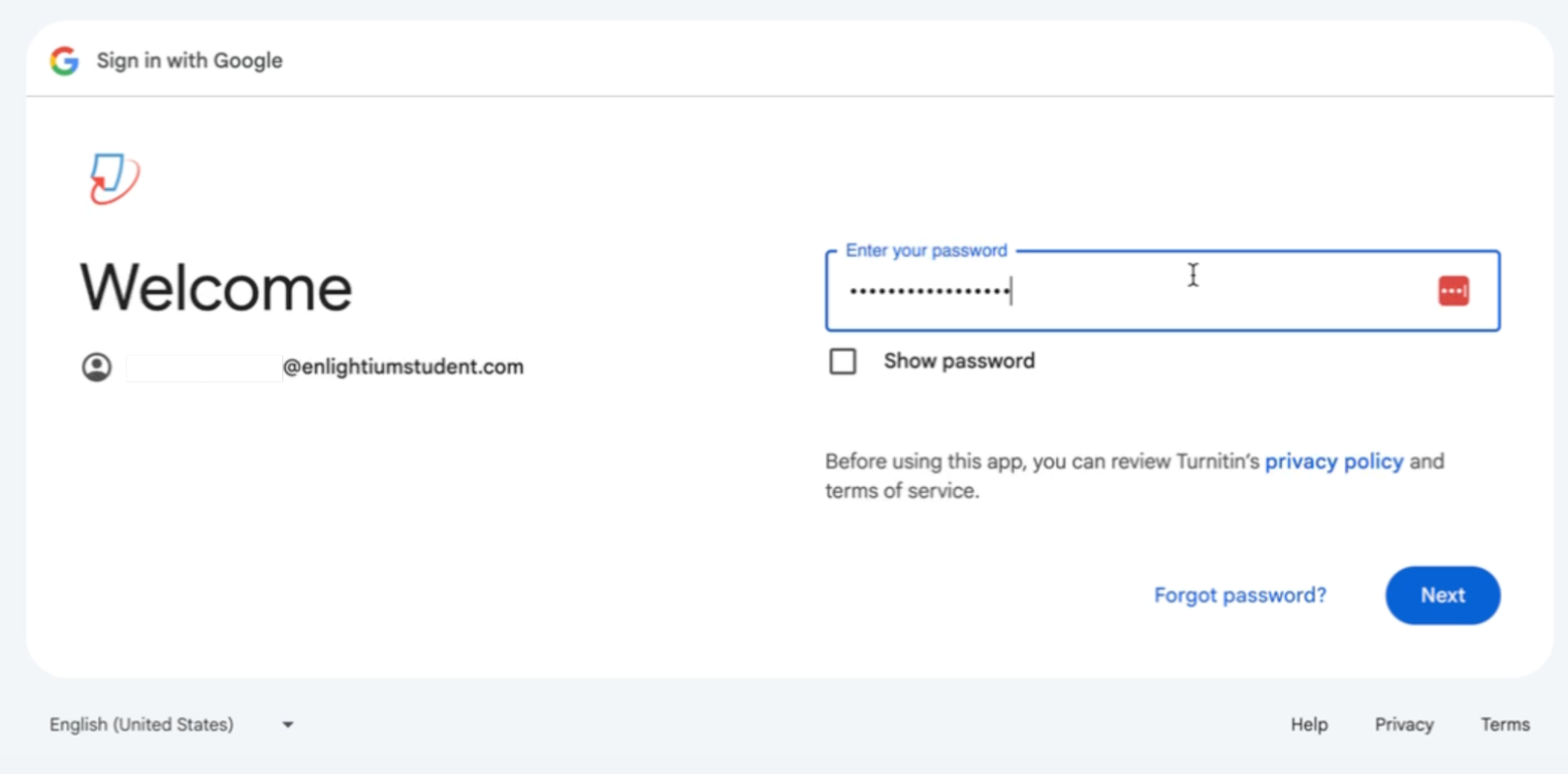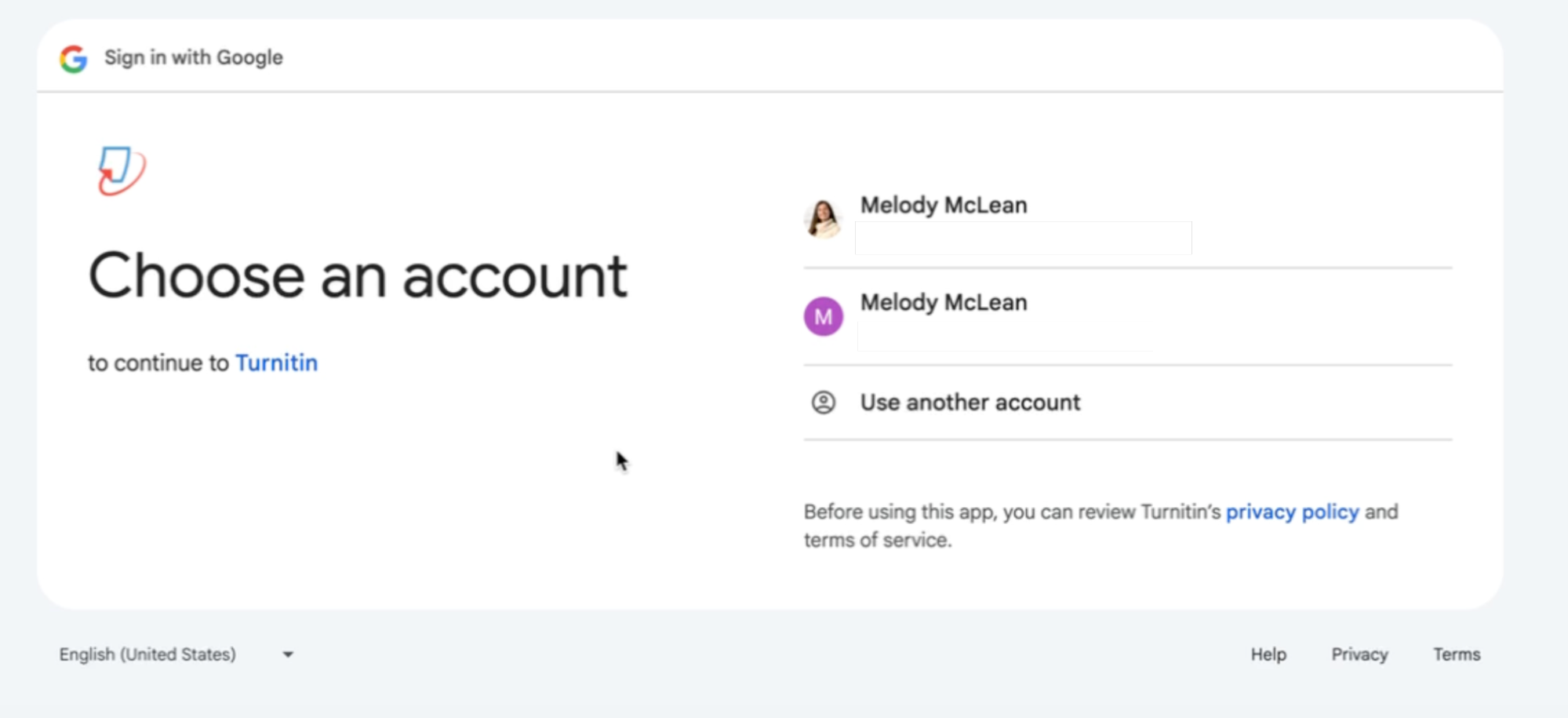 Note: The steps above only need to be completed the first time you log in to Turnitin using Single Sign-On (SSO). If you check “Remember this device,” future logins will be quicker—just click “Sign in with Google,” ensure your student email is selected, and you’ll be logged in automatically.