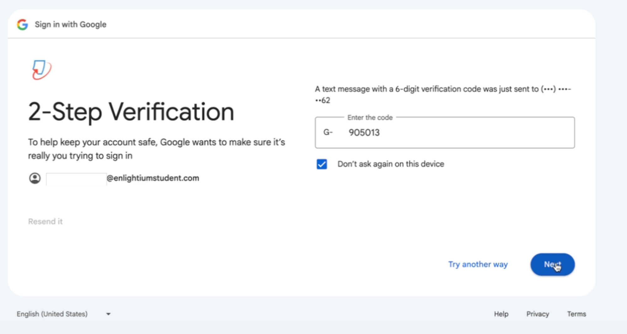 - Lastly, you'll need to verify your account. Two-step verification was enabled when your student email was first set up. A verification code will be sent to the phone number or alternate email address you provided. Google will display part of the phone number or email address where the code was sent. Locate the code and enter it to complete the sign-in process.