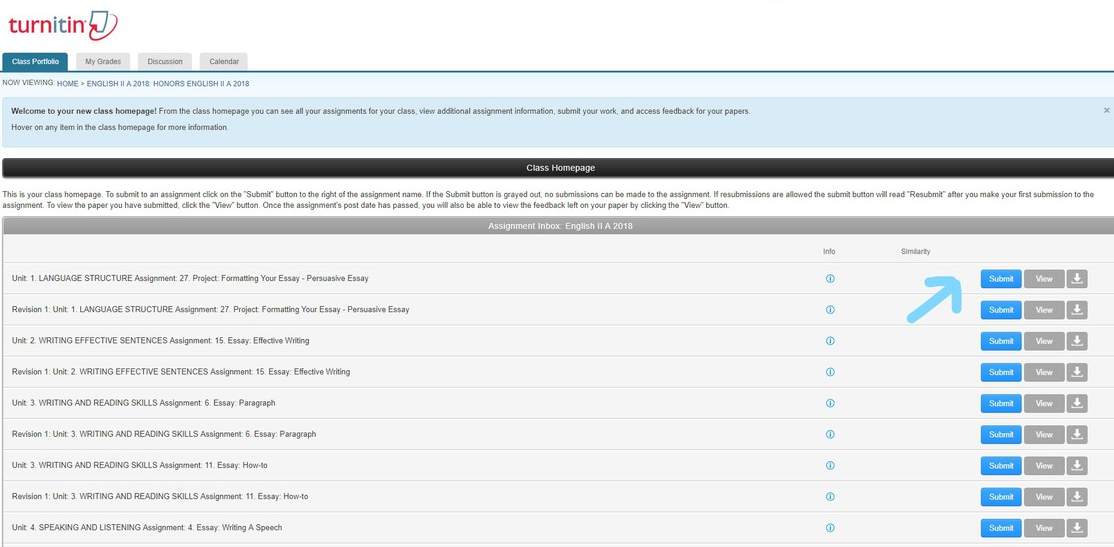 - There will be a list of all the assignments for this selected course; if the assignment is not listed, please let your teacher know. There is a revision assignment for every regular assignment. Click the “Submit” button for the assignment you want to submit.