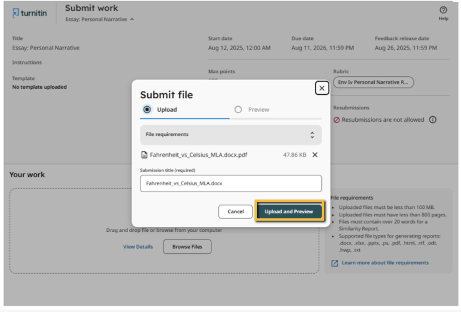 - Once you have selected your paper, on the pop-up, make sure your Submission Title is named correctly and click "Upload and Preview."