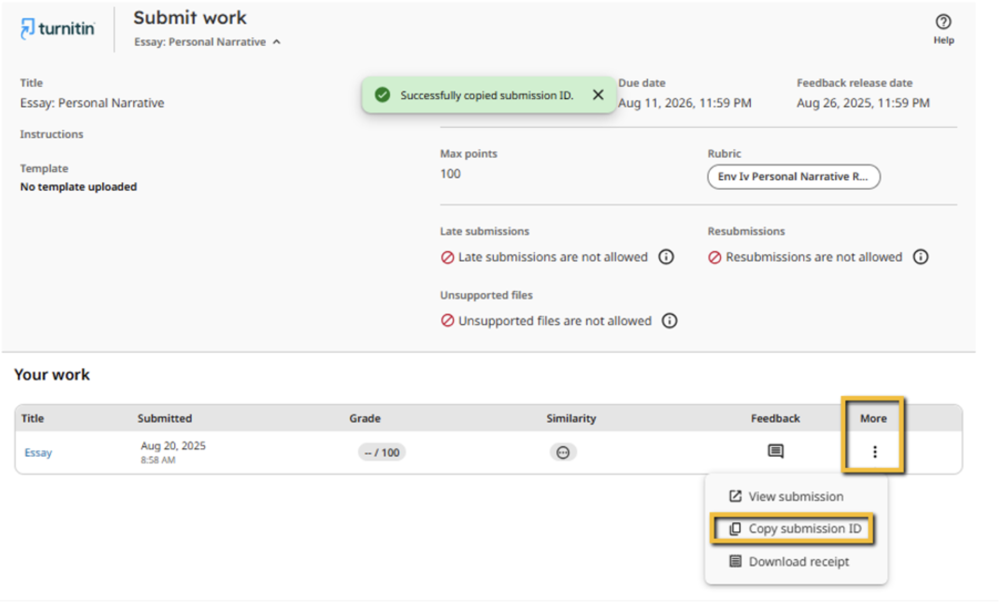 - Finally, ensure that "your file was successfully uploaded," and shows up under "Your work" at the bottom. Be sure to click the 3 dots under "More" and "Copy submission ID" for you to submit in Ignitia.